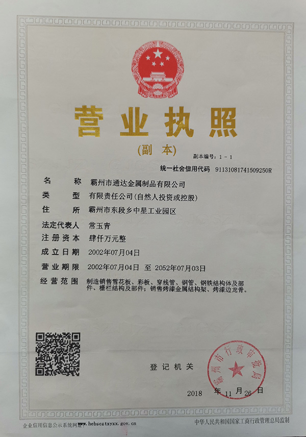 河北省霸州市通達金屬制品有限公司是一家生產熱鍍鋅管<預鍍鋅管>及熱鍍鋅板帶的生產企業。公司具有很強的經濟實力。本公司地理位置優越,交通便利,處于京津保滄四大城市交匯中心的勝芳鎮。由于公司不斷發展壯大,良好的投資環境為我公司的發展提供了可靠的保障。本公司是河北省重合同守信用企業,被評為AAA級信用企業。